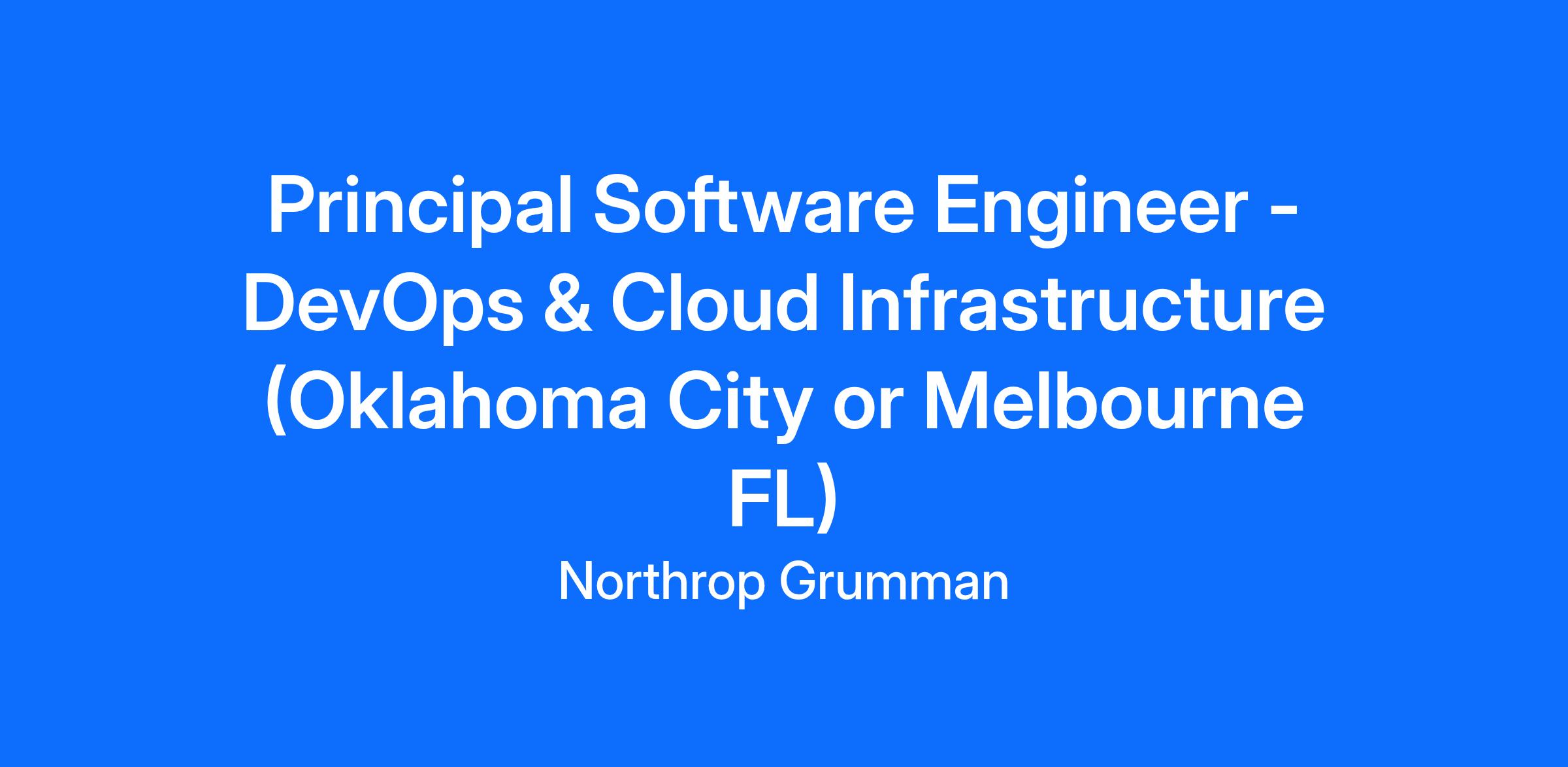 Northrop Grumman Aerospace Systems has an opening for a Principal Engineer Software - DevOps & Cloud Infrastructure to join our DevOps and Cloud Infrastructure team of qualified, diverse individuals. This position will be located on-site in Oklahoma City Oklahoma or Melbourne FL.