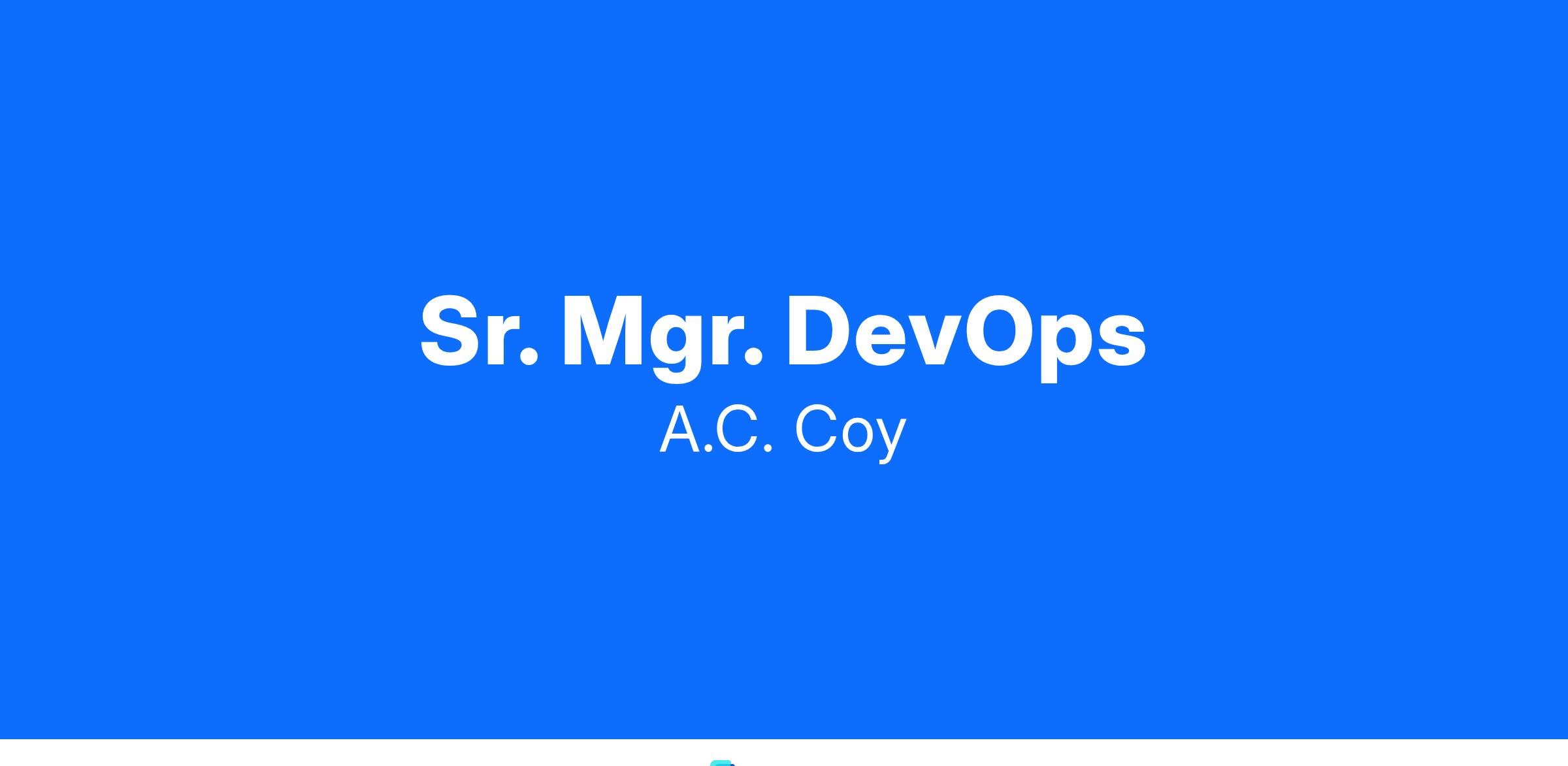 The A.C. Coy company has an immediate opening for a Senior Manager DevOps. Ideal candidates must have a Bachelor's degree or equivalent experience, 7+ years of technical experience which includes managing technical resources, experience working in a cloud environment (Azure, WS or GCP).