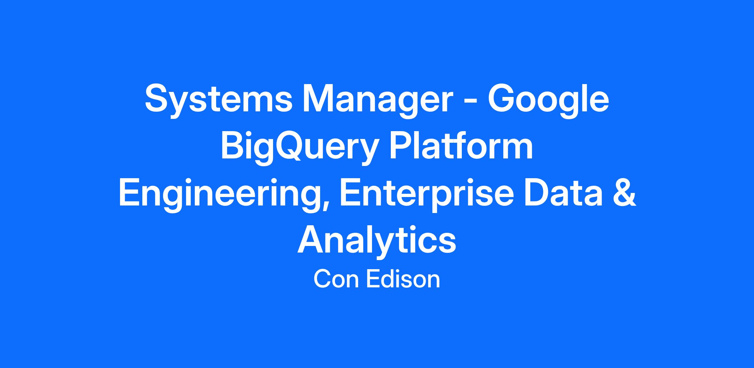 DescriptionThe Systems Manager, Google BigQuery Platform Engineering, Enterprise Data & Analytics, leads the strategy, delivery, and operational excellence of Con Edison's enterprise data platform on Google Cloud. This role provides end-to-end ownership of data ingestion, governance, and platform performance to ensure that enterprise data is reliable, secure, and ready to support analytics, regulatory reporting, and advanced AI/ML initiatives.The Systems Manager oversees the engineering, architecture, and operations of BigQuery and associated data intake services, ensuring adherence to enterprise standards for reliability, scalability, and cost efficiency. This includes managing the full data lifecycle from intake and transformation to consumption while maintaining strong controls around data quality, security, and privacy. Partnering with Data Governance, Analytics, AI/ML, and Application teams, this role translates enterprise data strategy into production-grade solutions that power business insights and grid modernization. The position also manages internal staff and external vendors to deliver continuous improvement and operational resilience across Con Edison's data ecosystem.